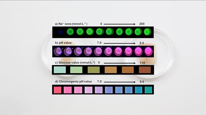 Dans ce cas précis, quatre types de capteurs dont la couleur varie dans différentes tonalités sont à l’étude : l’un sensible au pH, un autre au taux de glucose, un troisième au sodium. Le dernier capteur réagit, lui aussi, aux variations de pH mais fluoresce sous lampe UV.